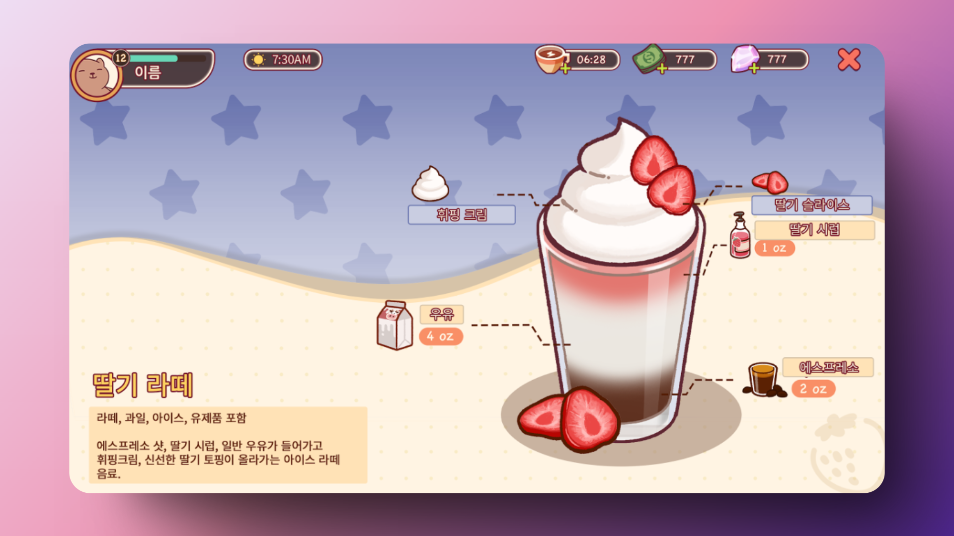 • 플레이어는 손님들의 취향에 맞춰 완벽한 커피를 만들어야 합니다.