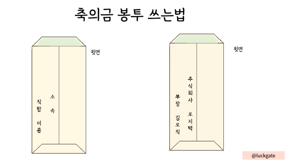 부의금 봉투의 뒷면에도 본인의 이름을 왼쪽 하단에 세로로 씁니다. 이름 위에 소속이나 직함을 적으면 더 좋습니다. 예를 들어, 회사 동료는 "OO회사 김대추"이라고 쓸 수 있습니다.