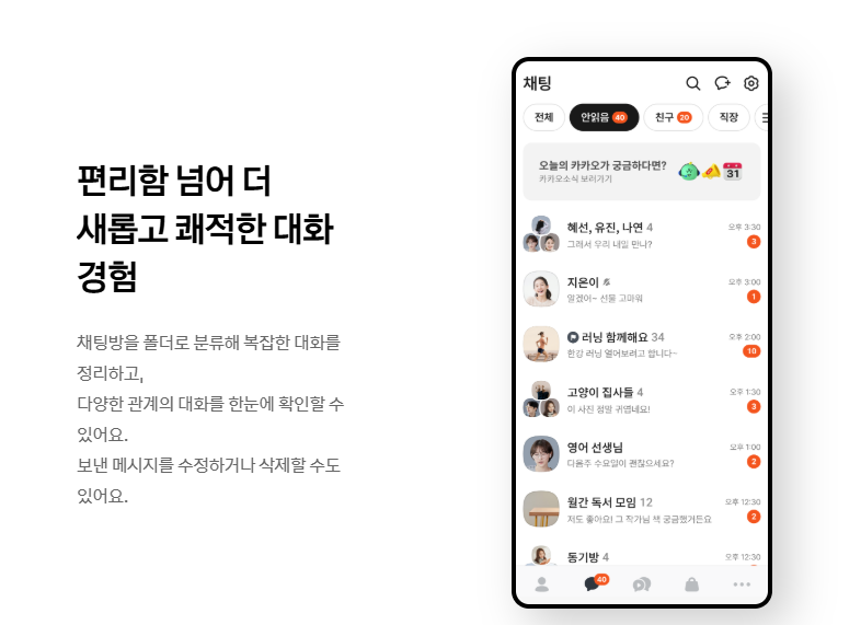 더 이상 앱을 전환할 필요 없이, 대화창 안에서 필요한 정보를 바로 얻을 수 있게 된 거예요.카카오 관계자에 따르면, 앞으로는 음성 메시지 요약, 이미지 기반 대화 인식, 감정 요약 기능 등도추가로 업데이트될 예정이라고 밝혔어요.즉, 카카오톡이 단순한 메신저를 넘어 AI 개인 비서 플랫폼으로 발전하고 있는 셈이에요!