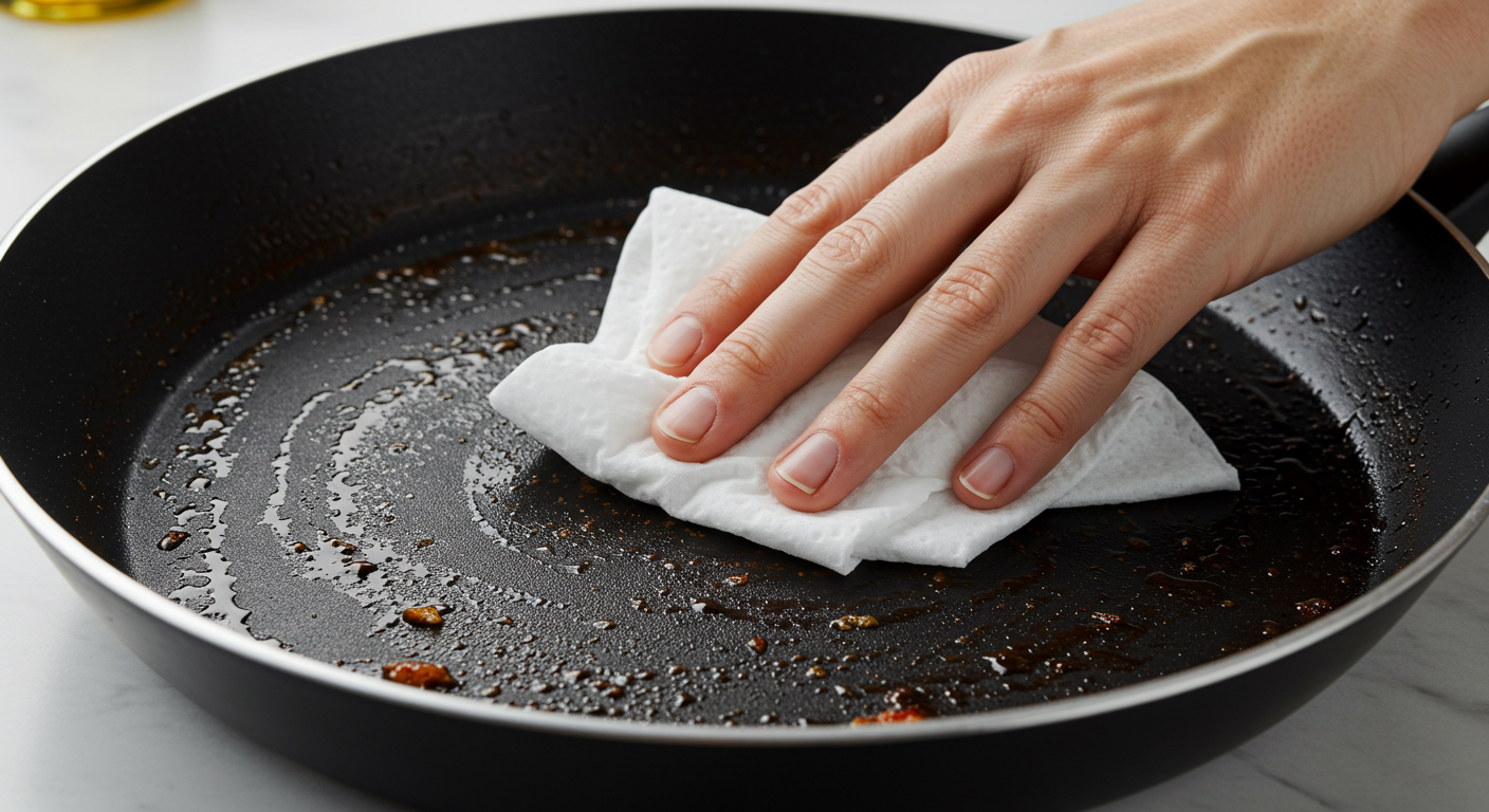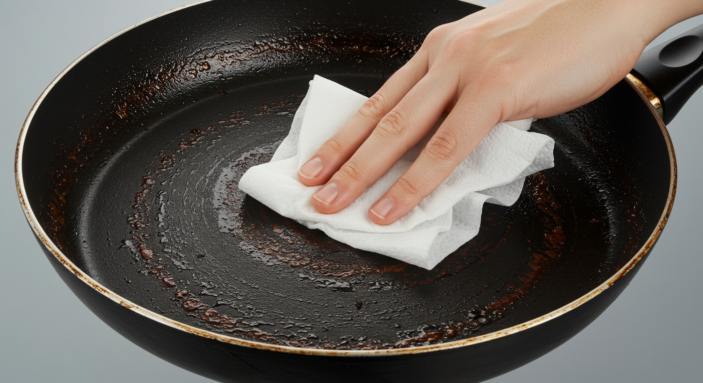 - 방법: 후라이팬에 식용유를 적당히 뿌린 후, 키친타월로 부드럽게 닦아줍니다. 이렇게 몇 번 반복해서 닦아주면 검은 연마제들이 서서히 제거됩니다. 키친타월에 묻은 검은색 이물질이 바로 연마제랍니다.