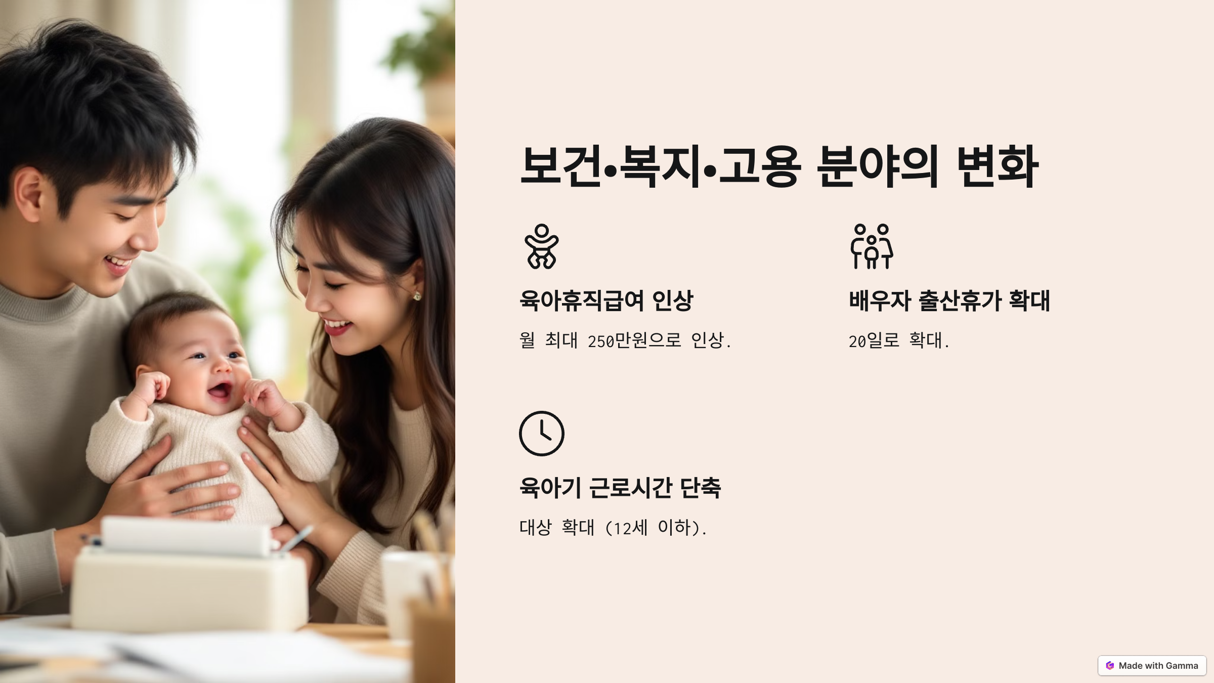 2025년 정책 변화는 저출산 문제 해결과 일·가정 양립 지원에 중점을 두고 있습니다. 특히 육아휴직 제도 개선과 교육 지원 확대는 양육 부담을 덜어주는 데 큰 도움이 될 것으로 기대됩니다. 향후 이러한 정책들이 실효성 있게 운영되도록 지속적인 모니터링과 개선이 필요할 것입니다.
