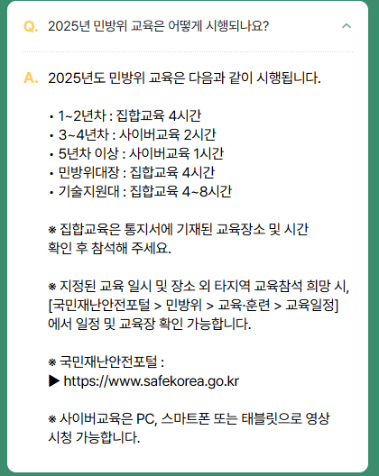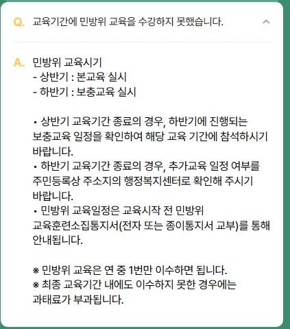 - 문의사항: 교육 내용이나 시스템 오류 등 궁금한 점이 생기면 해당 사이버 교육센터의 고객센터나 본인 소속 읍·면·동 주민센터(행정복지센터) 민방위 담당자에게 문의하면 친절하게 안내받을 수 있습니다.