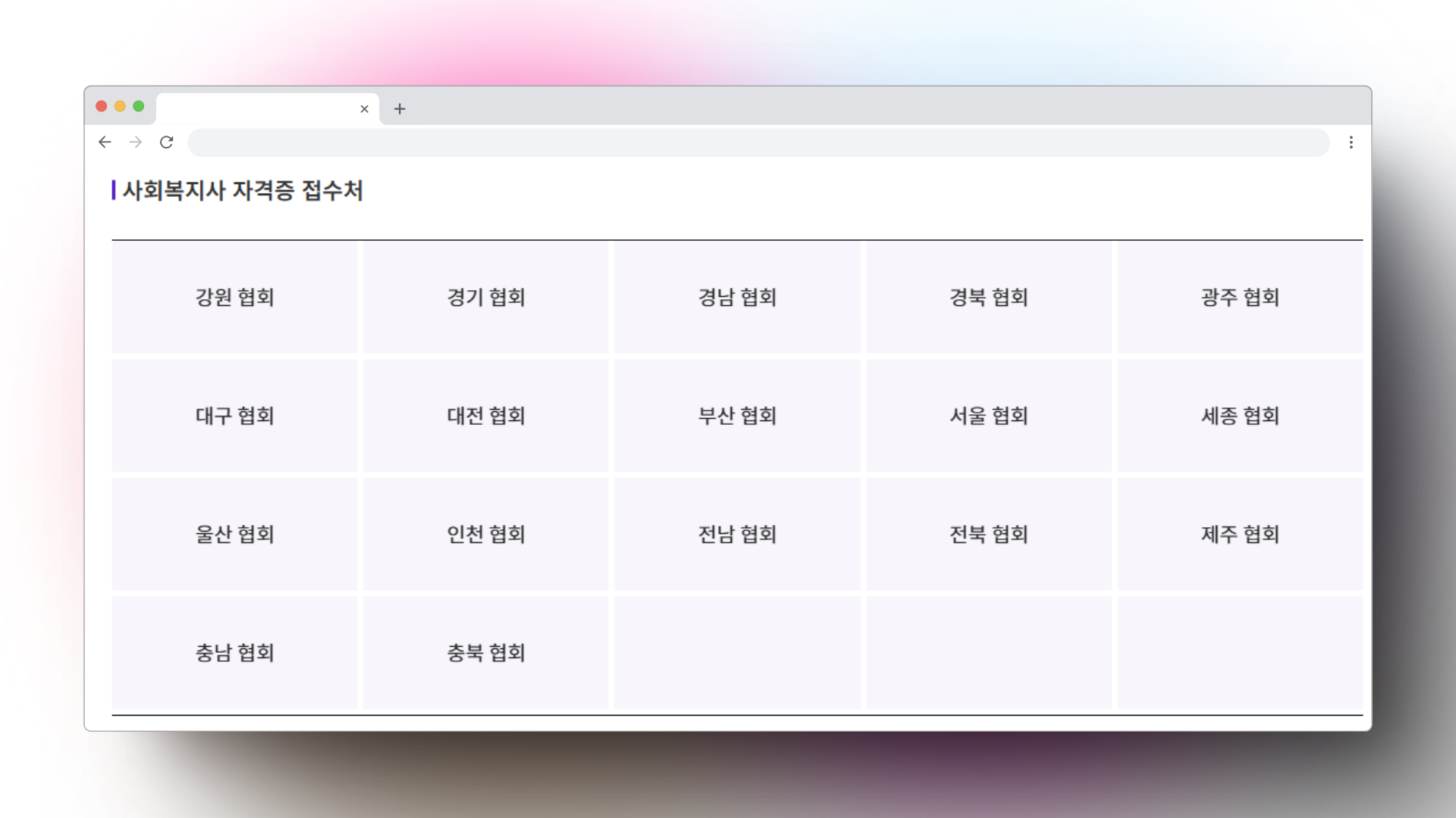 전국 17개소: 신청자는 거주지 또는 학업지에 해당하는 지방사회복지사협회를 선택합니다.
