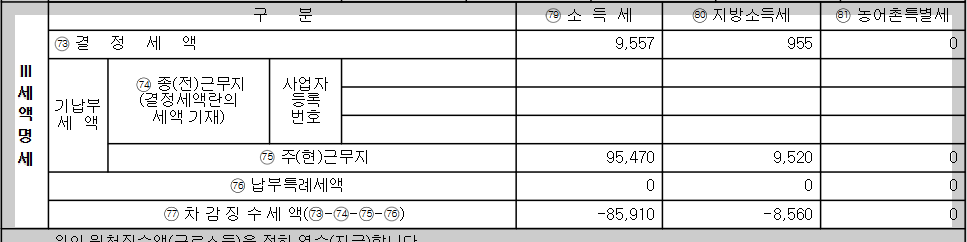 - 원천징수 영수증의 76번 차감징수세액을 확인합니다. 차감징수세액이 마이너스(-)면 환급, 플러스(+)면 추가 납부가 필요합니다.