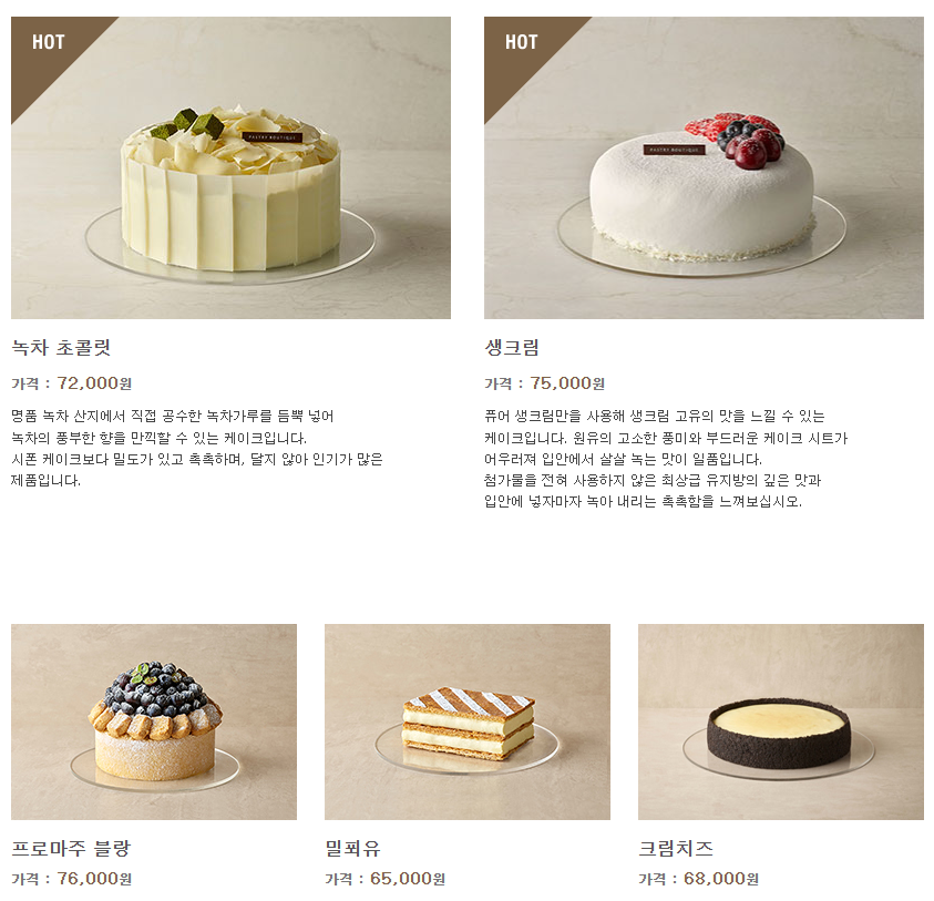 - 주요 케이크: 크리스탈 바닐라, 몽블랑, 리프 케이크