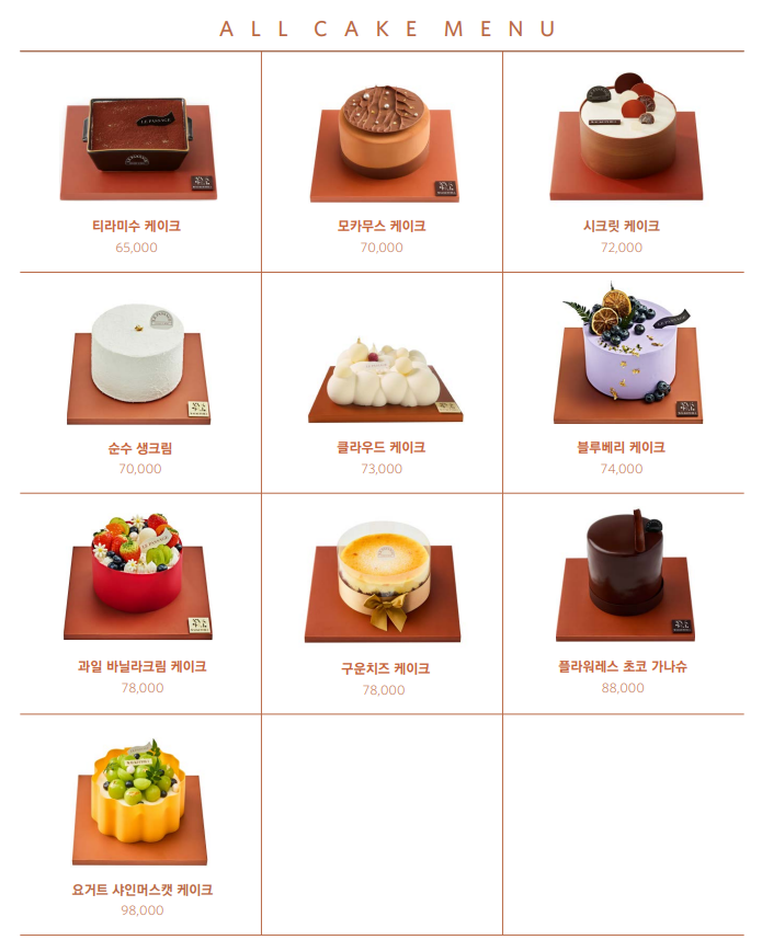 • 주요 케이크: 크리스탈 바닐라, 몽블랑, 리프 케이크