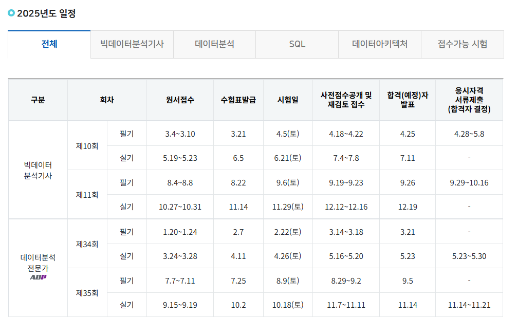 자격증 취득을 마음먹었다면 가장 먼저 확인해야 할 것이 바로 시험일정이겠죠. 2025년 ADSP 시험일정은 이미 한국데이터산업진흥원 데이터자격검정센터 홈페이지 에 공지되어 있습니다.