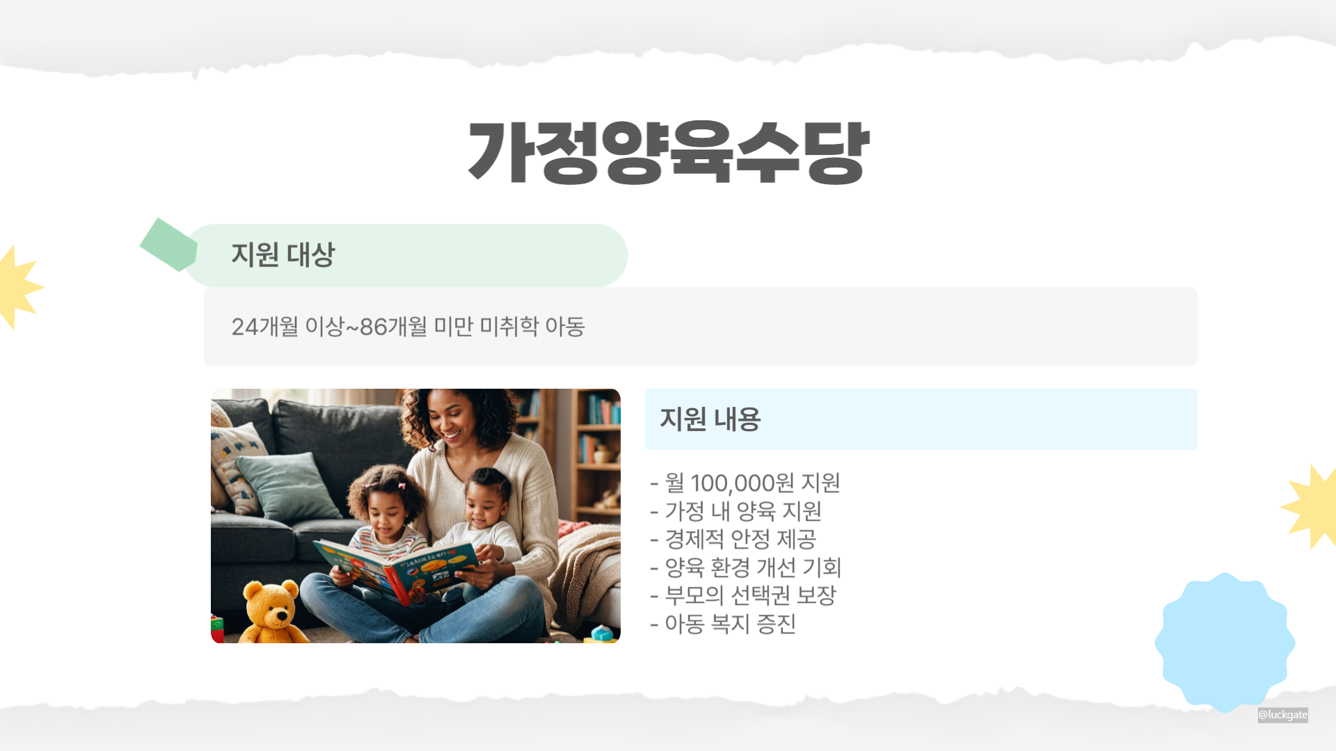 - 지원 내용: 월 100,000원 가정양육수당은 가정에서 아이를 양육하는 부모님들에게 경제적 안정을 제공하고, 아이들이 가정 내에서 양육되는 동안 필요한 지원을 할 수 있는 기회를 제공합니다.