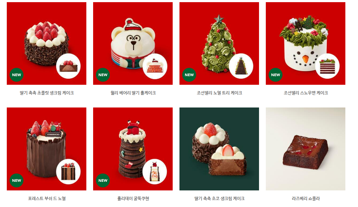 | 스타벅스 | 조선델리 스노우맨 케이크, 딸기/초코케이크 등 19종 | 11.14 ~ 12.15 | 12.01 ~ 12.25 | 3만~6만 원대 추정 | 스타벅스 앱, 리워드회원 10%할인, 아메리카노 쿠폰, 온라인 배송 시 추가 할인 |