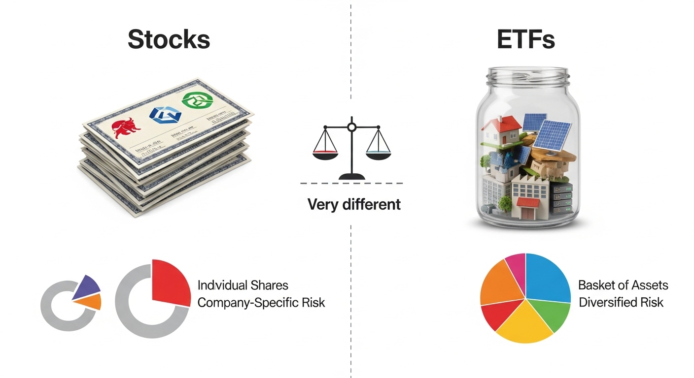 ETF는 여러 기업에 자동 분산되는 반면, 주식은 단일 기업에 모든 리스크가 집중되는 구조라 투자 난이도 자체가 달라요.